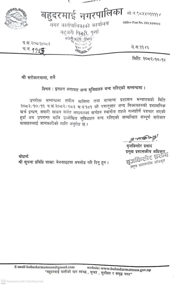 ईन्धन लगायत अन्य सुबीधाहरु बन्द गरिएको सम्बन्धमा।