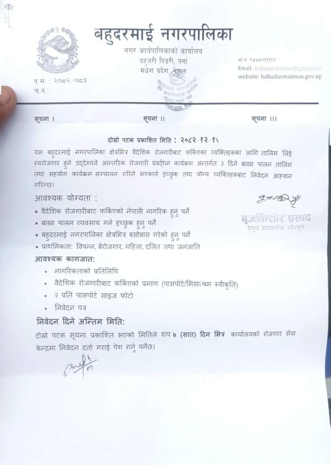 आज मिती २०८२ साल अषाढ १० गते मंगलबारका दिन यस बहुदरमाई नगरपालिका बहुअरी, पिडरी पर्साको आ.ब. २०८२/०८३ को निती तथा कार्यक्रम सार्बजनिकिकरण कार्यक्रम एक समारोहका बिच सम्पन्न भएको छ। निती तथा कार्यक्रम नगर उप-प्रमुख श्री सुस्मा कुमारी कुशवाहा ज्यु बाट प्रस्तु
