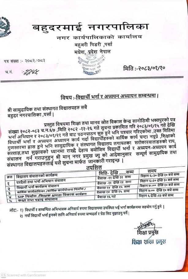 बिधार्थी भर्ना र अध्यन अध्यापन सम्बन्धमा।