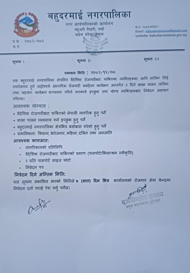 आज मिती २०८२ साल अषाढ १० गते मंगलबारका दिन यस बहुदरमाई नगरपालिका बहुअरी, पिडरी पर्साको आ.ब. २०८२/०८३ को निती तथा कार्यक्रम सार्बजनिकिकरण कार्यक्रम एक समारोहका बिच सम्पन्न भएको छ। निती तथा कार्यक्रम नगर उप-प्रमुख श्री सुस्मा कुमारी कुशवाहा ज्यु बाट प्रस्तु