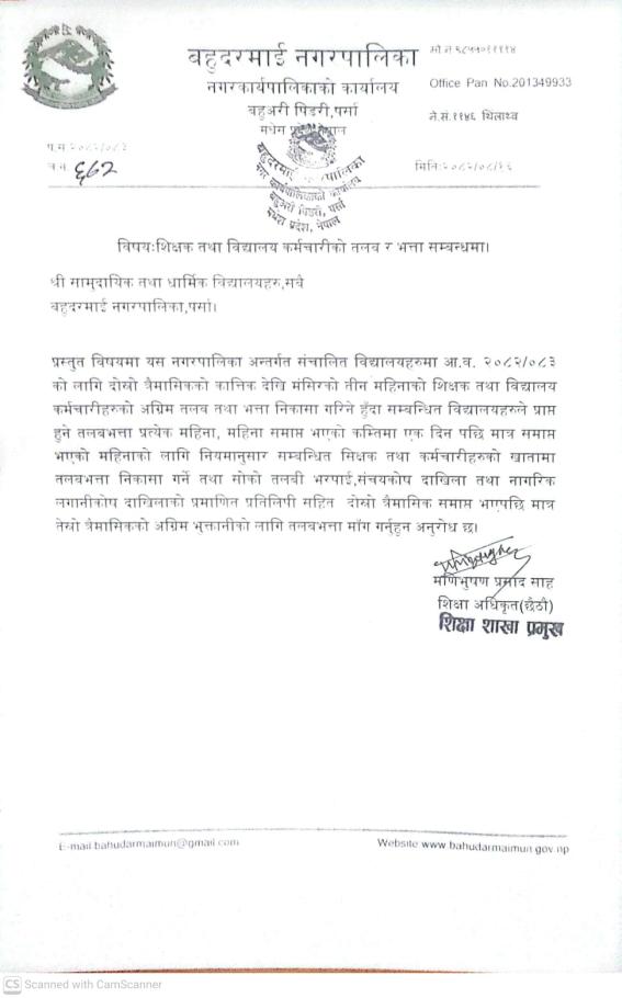 शिक्षक तथा बिधालय कर्मचारीहरुको तलब र भत्ता सम्बन्धमा।