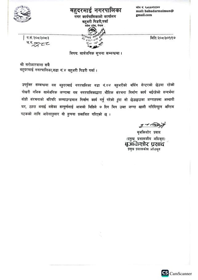 आज मिती २०८२ साल अषाढ १० गते मंगलबारका दिन यस बहुदरमाई नगरपालिका बहुअरी, पिडरी पर्साको आ.ब. २०८२/०८३ को निती तथा कार्यक्रम सार्बजनिकिकरण कार्यक्रम एक समारोहका बिच सम्पन्न भएको छ। निती तथा कार्यक्रम नगर उप-प्रमुख श्री सुस्मा कुमारी कुशवाहा ज्यु बाट प्रस्तु